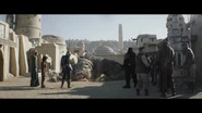 Cad Bane attempts to coerce Boba Fett to avoid conflict with the Pyke Syndicate, but he refuses to change his mind, and decides against killing Bane even after he reveals he framed the Nikto Sand Riders for killing the Tusken Raiders. He shares his goal with The Mandalorian to die in the name of honor, who swears to do the same as part of his creed. After the residents of Freetown arrive to protect the two from the Pykes, they celebrate that the Pykes are falling back, until being introduced to Scorpenek droids that pose a threat large enough to ruin the whole city. With the organized resistance outmatched, the Freetown garrison and the Mods retreated until they couldn't go any further, and the untimely arrival of Peli to deliver Grogu to the Mandalorian put them all in danger.