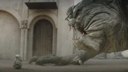 Boba Fett's rancor is an unnamed rancor owned by Boba Fett in the live-action television streaming series The Book of Boba Fett. Though initially seen as hostile monsters, rancors are emotional creatures capable of doing good when kept at an ideal temperament by their masters. Due to their size and strength however, they can indiscriminately cause harm when provoked. This specific rancor was saved and kept by unknown rancor keeper, who taught Fett that they could reward their masters when treated as pets. He was formerly owned by the Twins, who gifted it to Boba Fett as a compromise for Black Krrsantan failing to kill him on their behalf. Boba Fett, with the help of its trainer, was able to tame the rancor, allowing him to ride it to protect Mos Espa from the Scorpenek Droids unleashed by the Pyke Syndicate.
