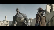 Boba travels on his rancor to the outpost where the Freetown garrison and the Mods are taking their last stand. He successfully rescues them from the Pykes, but complications arise when Cad Bane uses his wrist-mounted flamethrower to scare the rancor, who throws Boba off of his back and flees. The rancor goes on a rampage, unsure of what to do, scaring the people of Mos Espa into shooting it. The Mandalorian tells them to stop shooting him since doing so would only make it more aggressive. He attempts to reach the chains of the rancor to mount it, but rancor shakes him off and tries to eat him. Grogu then uses the Force to calm the rancor to sleep and then cuddling next to it to do the same.