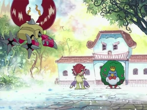 He made a brief appearance when T.K. Takaishi escaped from Puppetmon during the kids' first meeting with him, then he and Floramon encountered the rest of the DigiDestined after the group had divided up. Deramon gave the kids a tour of Puppetmon's mansion, and agreed to help the kids fight him by firing a cannon at him. When Puppetmon threatened them, Deramon and Floramon fled, and were not seen again.