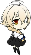 En route to the Himezuru residence, Es spotted Elise von Klagen, noting her to be particularly suspicious since she could physically see the household. Making their introductions to the young mage, Es and Tōya escorted her inside the house, leading them to dealing with Elise and Kuon's unique antics. The following morning, Es went alongside the trio of Elise, Kuon, and Tōya to go shopping for the former two, but were shocked when they ran into Acht. Preparing herself for battle, Es lowered into a fighting stance, and analysed the Sage's new Drive, but did not attack as the tension lowered from Acht's lack of will to fight at the time.