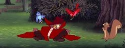 The Forest Animals are first seen when Aurora enters the woods, to pick berries for her aunts. While Aurora is singing she wakes the animals who, one by one flocks to her. The owl nearly falls down from a tree when he wakes up but Aurora saves him with her basket. Aurora notices two birds cuddling with each other and she starts to sing "I Wonder" and the owl gives her a rose. The Forest Animals follows her as she goes to the end of the forest where she stares at the castle and dreams away. She talks to them about how her aunts treats her as a child and how she despite what they say have met someone. The Forest Animals listens to her very attentively when she explains how she met a prince in her dreams. They all seem disappointed when she says that everytime she dreams the prince will kiss her she wakes up. One of the squirrels notices some clothes hanging on a tree branch and makes a plan with some other of the animals to take them and portray as Aurora's dream prince thus making her happy. Unknowingly for the animals they took Prince Phillip's cape, hat and boots. The animals goes back to Aurora whom is sitting with a chipmunk in her lap. She sees her "dream prince" and goes in on the whole charade, starting dancing and singing "Once Upon a Dream". Later Philip comes and the two sings and dance together, meanwhile the animals follows them and looks very happy for Aurora. The Forest Animals follows Aurora when she runs away from Philip and after that are never seen again in the movie.