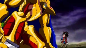 Grademon is Digimon with golden armor always carring two swords, He also has blue cape, when corrupted his armor turn to purple color.