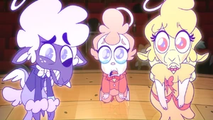 Keenie is a small cherub who takes the appearance of an anthropomorphic sheep with light yellow skin, and slight darker-colored ears and hair which is short-cut and puffed upwards. Her eyes have light reddish-pink irises with periwinkle-colored pupils, and upper eyelids colored in a shade of faded light pink.