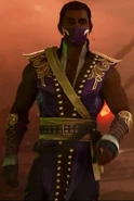 The heroic version of Rain has long hair with a ponytail, and he wears royal clothing, his clothing is purple and his shoulder pads are yellow and his mask is purple with yellow decorations.