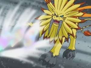 SaberLeomon first appeared when he rescued Mimi, Palmon, Joe, and Gomamon from MetalEtemon. When MetalEtemon showed up, Leomon then Digivolved to SaberLeomon once again to battle MetalEtemon. SaberLeomon took a fatal attack from MetalEtemon when he saved Mimi. With his remaining strength, SaberLeomon killed MetalEtemon by impaling his chest, and reverted back to Leomon before he died.