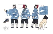 He wears a white cloud-patterned jinbei kimono with a light blue shirt, dark blue pants fastened on the shins with white kyahan guards. He has a black traditional socks tabi, wears similar sandals to the ones Tanjiro has, with the only difference being that the straps are dark blue. When he travels, he also wears a white cloth that covers the head and wraps around his neck.