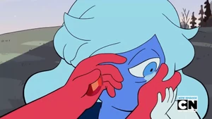 Sapphire and Ruby have a romantic relationship. The romantic nature of their relationship has been confirmed by both Joe Johnston and Ian Jones-Quartey.[2][3][4] The first time they are seen on the show, she kisses Ruby, who is crying tears of relief after discovering she is safe. Garnet's dialogue in "Love Letters" reveals that their relationship developed over a period of time. In "Keystone Motel", because they were mad at Pearl for lying, they temporarily split up to calm down and come to terms with each other's feelings toward Pearl's actions. She is shown to be the calmer member of the relationship (as she said she was filled with rage but looked as calm as she was), sometimes to the point of seeming aloof, which infuriates Ruby further. "Keystone Motel" also reveals that their relationship can be strained at times due to Sapphire's precognition, causing her to be preoccupied with the outcome of events, instead of the events as they happen. This caused them some degree of conflict throughout the episode, as Ruby was angry that Sapphire was so willing to forgive Pearl after manipulating them and that Sapphire seemed to dismiss her feelings. They share a great concern for Steven, which ultimately leads them to talk about and resolve their conflict at the end of the episode, and they form Garnet once more.