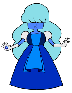 Sapphire wears a floor-length gown with white, rounded, puffy sleeves, a navy top, and a blue skirt. Her dress has a blue pinafore over the top. The skirt has several frilly layers in several shades of blue which resemble an open geode. She also wears white elbow-length evening gloves. Sapphire has feet that are usually hidden by her dress. Her gemstone is in the palm of her right hand and has a triangular facet.