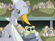 When Takuya, Zoe, Koji, Tommy, J.P. and Koichi traveled to the village, Swanmon sees them as intruders, but once the DigiDestined explain that they are not there to harm the children, she accepts their help in caring for the babies and feeds them in return. She directs the DigiDestined to the Trailmon who should service the Village, but the Royal Knights attack, and she is heavily injured attempted to protect the village and its inhabitants. Though the village itself is lost, Swanmon is successfully evacuated along with the children and eggs on the Trailmon.