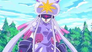 Thetismon is an Ultimate Digimon that resembles an anthropomorphic jellyfish. A sun-like tattoo is engraved her bell. Her hand is also mechanized to store and accumulates electricity. She also has long, tentacle-like hairs and two notably long tentacles that emits medicines.