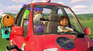 Tip helps Lucy to take the car down to the ground.