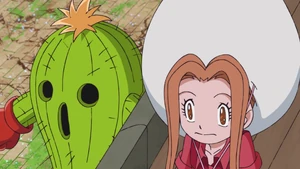 Mimi resolve to stay by Palmon's side causes her to evolve into Togemon. Togemon defeats the Drimogemon while Greymon breaks one of Ogremon's horns, driving him away.